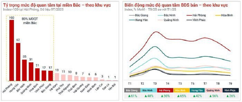 Nếu lấy lượt tìm kiếm bất động sản Hải Phòng trong 9 tháng đầu năm 2025 làm mốc tham chiếu với chỉ số 100 thì Hưng Yên đứng thứ 2 với chỉ số 62, tiếp theo là Bắc Ninh với chỉ số 35. Đây đều là những nơi được đầu tư lớn về hạ tầng, thu hút FDI mạnh và có nhiều khu công nghiệp tại miền Bắc.