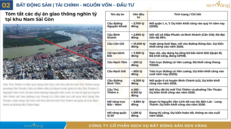Khu Nam Sài Gòn trở thành “tâm điểm đầu tư nghìn tỷ” với hàng loạt công trình lớn: Cầu Nguyễn Khoái, Bình Khánh, Cần Giờ, Thủ Thiêm 4, Quốc lộ 50 và trục Bắc – Nam, tổng vốn trên 50.000 tỷ đồng.