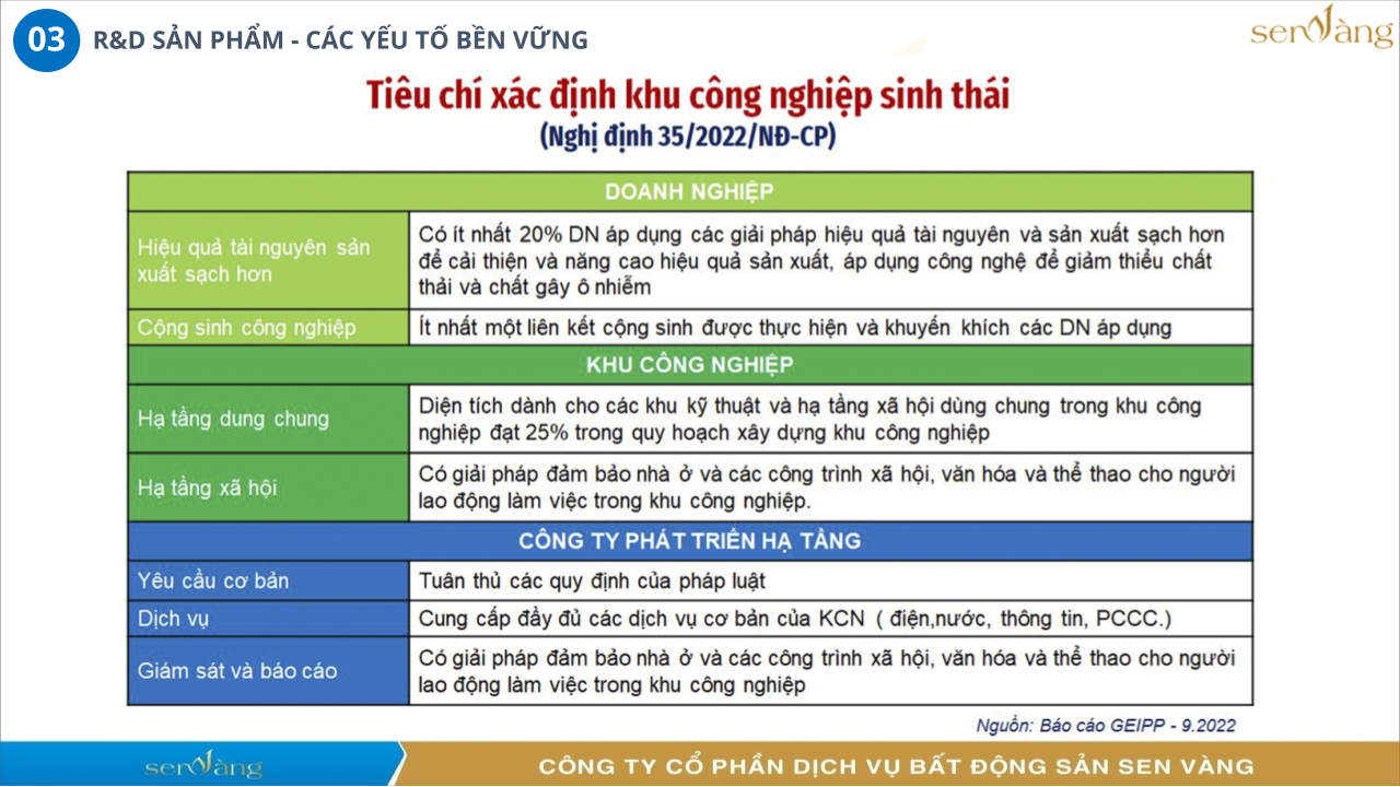 - Chứng chỉ KCN sinh thái (eco-industrial park), đảm bảo vận hành bền vững.