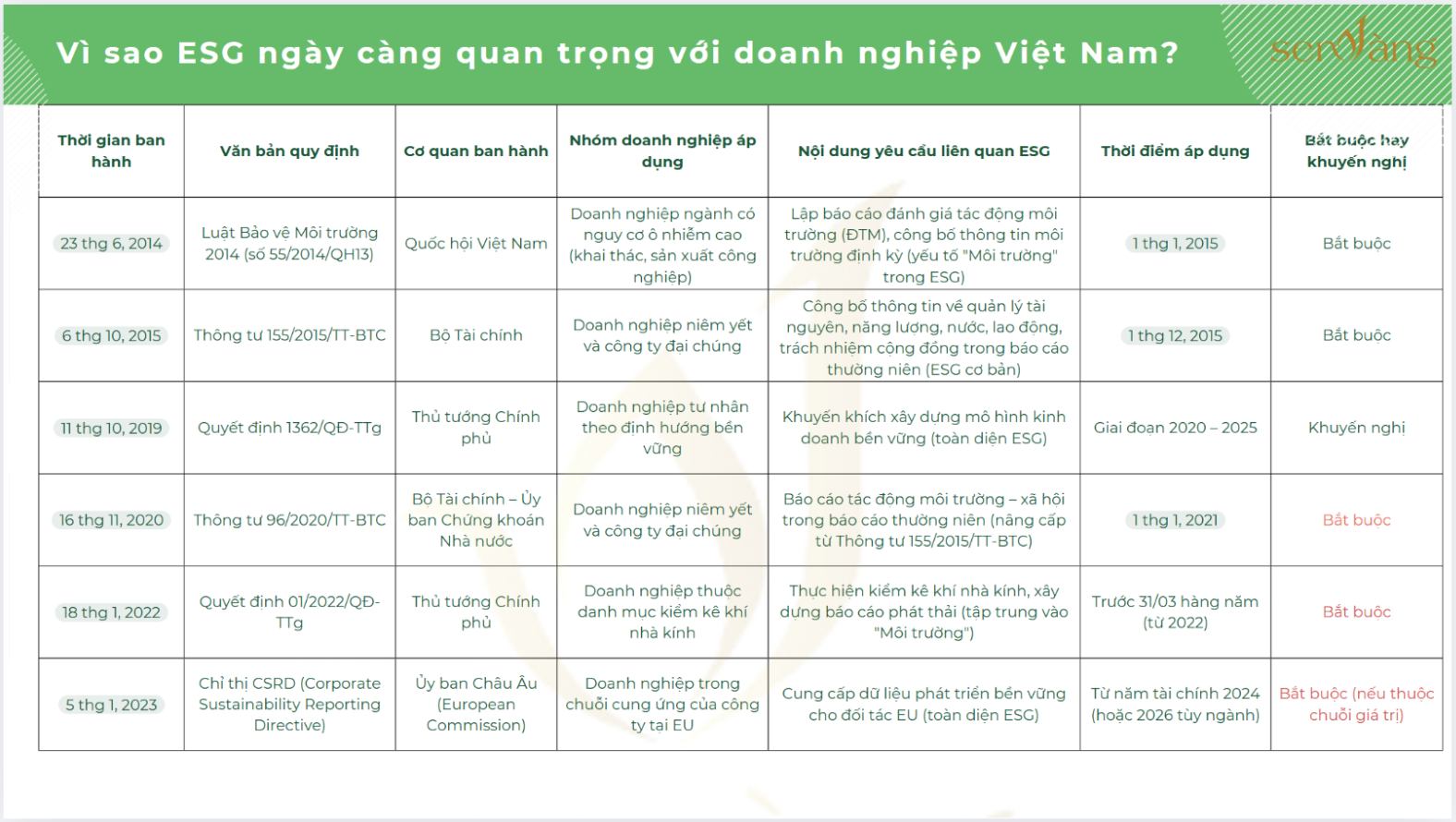- Quyết định 01/2022/QĐ-TTg của Thủ tướng Chính phủ, yêu cầu các doanh nghiệp thuộc danh mục kiểm kê khí nhà kính báo cáo phát thải trước ngày 31/3 hàng năm, tập trung vào yếu tố Môi trường của ESG.