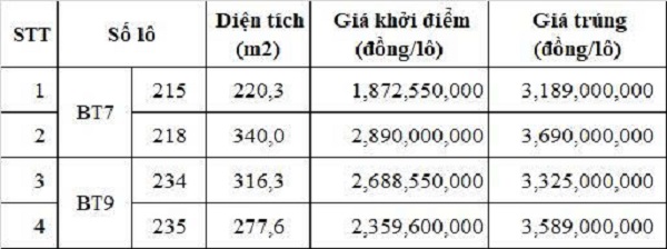 Thông báo đấu giá 04 lô đất thuộc quỹ đất 10% Dự án xây dựng Khu nhà ở Nam sông Lạch Tray tại phường Hưng Đạo, TP Hải Phòng Ngày đăng : 13/12/2025 | 141 lượt xem Trung tâm Dịch vụ đấu giá tài sản số 1 phối hợp với Trung tâm phát triển quỹ đất thành phố Hải Phòng tổ chức đấu giá quyền sử dụng 04 lô đất thuộc quỹ đất 10% Dự án xây dựng Khu nhà ở Nam sông Lạch Tray tại phường Hưng Đạo, TP Hải Phòng. Theo Quyết định số 349/QĐ-UB ngày 07/02/2003 của Ủy ban nhân dân thành phố về việc phê duyệt quy hoạch chi tiết Khu nhà ở Nam sông Lạch Tray của Công ty Cổ phần Xây dựng số 5 Hải Phòng. Các lô đất có tổng diện tích: 1.154,2 m2 (gồm 04 lô). Giá khởi điểm 8.500.000 đồng/m2.