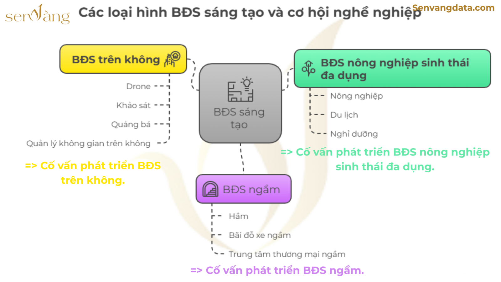 - Cố vấn phát triển BĐS ngầm: Tư vấn hầm, trung tâm thương mại ngầm. Tại Việt Nam: Có từ 2015, thấp phổ biến (hầm Bến Thành). Thế giới: Phổ biến từ 1980 (CBRE, JLL). Yêu cầu: Kiến thức kỹ thuật, pháp lý, GIS, AI. Cơ hội: Tăng từ 2026 do đô thị hóa.