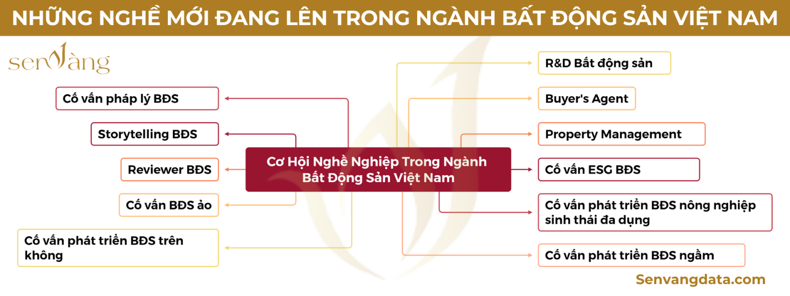 - Cố vấn pháp lý BĐS (người mua): Tư vấn hợp đồng, AI từ 2026. Tại Việt Nam: Có từ 2000, trung bình phổ biến. Thế giới: Phổ biến từ 1990. Yêu cầu: Bằng luật, kỹ năng đàm phán, blockchain. Cơ hội: Hấp dẫn Gen Z nhờ tính cá nhân hóa.