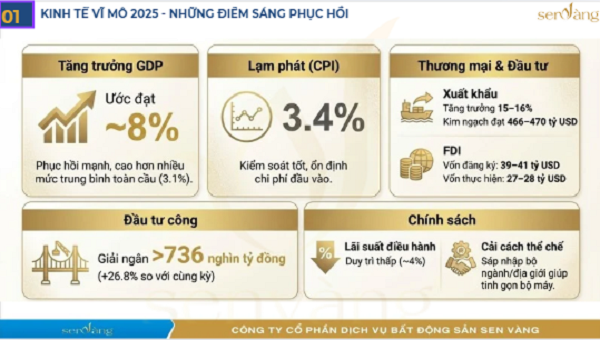 Tăng trưởng GDP: Đạt mục tiêu cơ bản 8%, dựa trên nền tảng vững chắc từ sản xuất, xuất khẩu, tiêu dùng và động lực mới từ đầu tư công. Kiểm soát Lạm phát: Giữ vững dưới mục tiêu 4%, tạo niềm tin cho người tiêu dùng và doanh nghiệp. Xuất khẩu & FDI: Xuất khẩu tăng 15-16% so với cùng kỳ. Vốn FDI tiếp tục đà tăng, trong đó BĐS là ngành thu hút vốn lớn thứ hai sau công nghiệp sản xuất. Giải ngân Đầu tư công: Có sự đột phá, tăng 26,8% so với cùng kỳ, đạt gần 750.000 tỷ đồng, biến 2025 thành “năm của cơ sở hạ tầng”. Lãi suất: Duy trì ở mức thấp để kích thích sản xuất và tiêu dùng. Cải cách Thể chế: Sáp nhập và tinh gọn bộ máy hành chính từ ngày 01/07/2025 (còn 34 tỉnh thành) bước đầu cho thấy hiệu quả.
