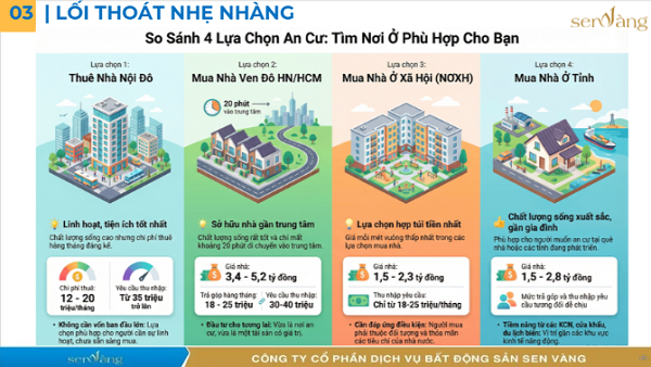 Thuê nhà ở Trung tâm: Thay vì cố gắng mua, việc thuê một căn hộ phù hợp (chi phí thuê chiếm khoảng 30% thu nhập) là giải pháp linh hoạt, giảm áp lực tài chính và cho phép trải nghiệm nhiều không gian sống khác nhau.