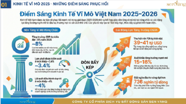Kỳ vọng tăng trưởng bất động sản đột phá: Việt Nam đặt mục tiêu tăng trưởng GDP tham vọng từ 9-10%, dựa vào nội lực từ tiêu dùng, đầu tư công và xuất khẩu. Các động lực mới từ kinh tế số, công nghiệp bán dẫn và chuyển đổi xanh được kỳ vọng sẽ tạo ra sức bật. Một làn sóng khởi công các đại dự án hạ tầng trên toàn quốc vào cuối năm 2025 sẽ là nền tảng cho sự phát triển này.