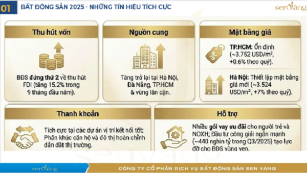 Thị trường bất động sản phục hồi: Nguồn cung tăng trưởng trên cả nước, thanh khoản và độ hấp thụ ở mức tốt, đặc biệt tại các thị trường trọng điểm như Hà Nội, TP.HCM và Bình Dương. Các chính sách hỗ trợ của nhà nước và việc tháo gỡ vướng mắc pháp lý đã khai thông nguồn cung.