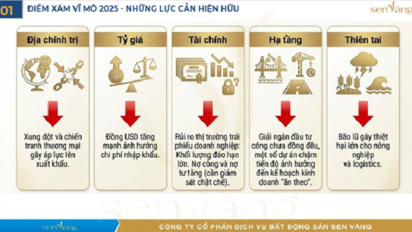 Bất ổn Địa chính trị: Các cuộc xung đột trên thế giới có xu hướng lan rộng (Thái Lan – Campuchia, rủi ro Trung Quốc – Đài Loan), ảnh hưởng đến an ninh kinh tế và dòng vốn đầu tư. Rủi ro Tỷ giá và Thuế quan: Đồng USD tăng ảnh hưởng đến chi phí nhập khẩu. Mỹ áp thuế cao lên các quốc gia bị cho là “sân sau của Trung Quốc”, trong đó Việt Nam bị ảnh hưởng nặng nề, làm giảm lợi thế cạnh tranh. Rủi ro Tài chính: Nhiều trái phiếu doanh nghiệp, đặc biệt trong lĩnh vực BĐS, đến hạn đáo hạn. Nợ công và nợ tư đều tăng. Hạ tầng: Việc triển khai hạ tầng chỉ tập trung ở một số khu vực trọng điểm; nhiều dự án vẫn kéo dài, trễ tiến độ. Thiên tai: Năm 2025 là một năm La Niña với số lượng bão lũ kỷ lục từ Bắc vào Nam, gây thiệt hại nặng nề về kinh tế, đời sống và phân tán nguồn lực của chính phủ.
