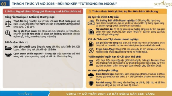 Bất ổn Bên ngoài: Rủi ro lớn nhất là an ninh chính trị khu vực và toàn cầu làm đứt gãy chuỗi cung ứng. Cạnh tranh Mỹ-Trung tiếp tục là yếu tố khó lường.Thách thức Nội tại: Rủi ro từ thị trường trái phiếu đáo hạn và nợ xấu vẫn hiện hữu. Chi phí đầu vào cho doanh nghiệp tăng cao (thuế, tiền sử dụng đất, vật liệu xây dựng). Vận hành Hành chính: Quá trình thay đổi luật lệ dồn dập và vận hành bộ máy sau sáp nhập có thể gây ra ùn ứ, nghẽn cục bộ trong ngắn hạn. An ninh Phi truyền thống: Biến đổi khí hậu, an ninh mạng, an ninh năng lượng và lương thực là những rủi ro ngày càng hiện hữu.