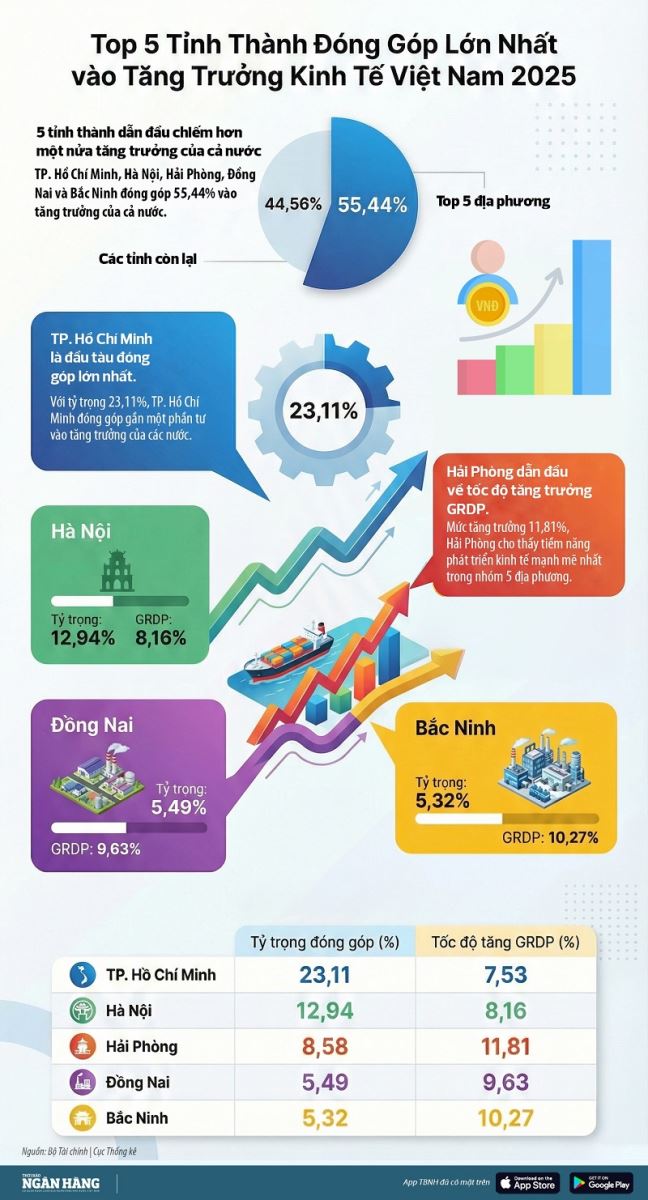 Lộ diện “quán quân” tăng trưởng cao nhất nước sau năm đầu tiên sắp xếp lại giang sơn Ngày đăng : 07/01/2026 | 50 lượt xem Theo cơ quan thống kê, trong bối cảnh GDP cả nước năm 2025 tăng trưởng khá, đạt 8,02%, tăng trưởng GRDP của các địa phương nhìn chung vận động theo xu hướng chung của nền kinh tế, tiếp tục phục hồi và mở rộng.