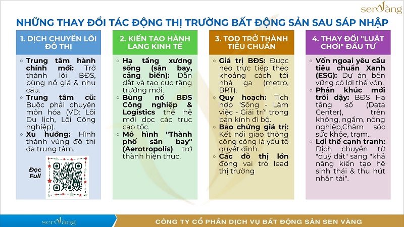 Bối cảnh Thay đổi Lớn: Việc sáp nhập các tỉnh thành và chủ trương đẩy mạnh hạ tầng công cộng đang tạo ra bốn thay đổi lớn: (1) Dịch chuyển lõi đô thị; (2) Kiến tạo các hành lang kinh tế mới; (3) TOD trở thành tiêu chuẩn quy hoạch; và (4) “Luật chơi” đầu tư thay đổi, ưu thế thuộc về các tập đoàn lớn (“Big Boy”) có khả năng tham gia vào các dự án hạ tầng theo hình thức đối tác công tư (PPP).