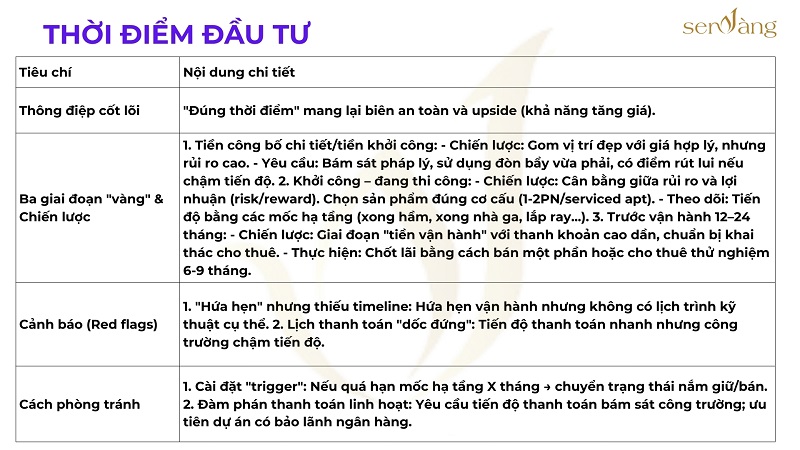 Cảnh báo (Red Flags): Chủ đầu tư hứa hẹn nhưng không có timeline cụ thể, tiến độ thi công chậm so với lịch thanh toán.