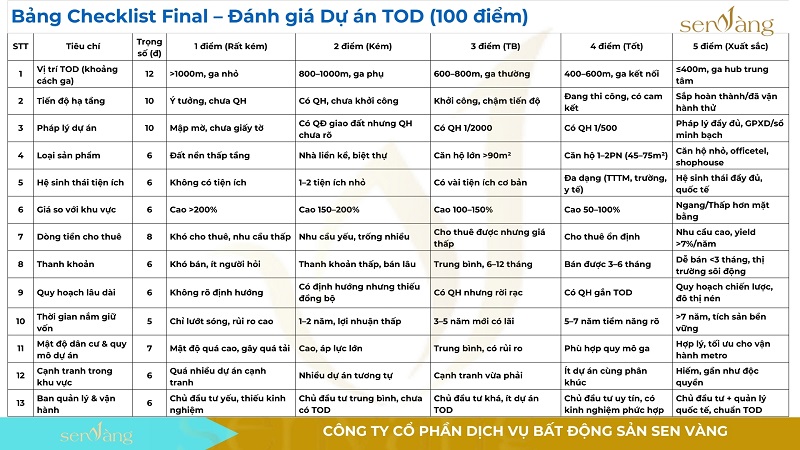 5. Bảng Checklist Đánh giá Dự án TOD (Hệ thống 100 điểm)