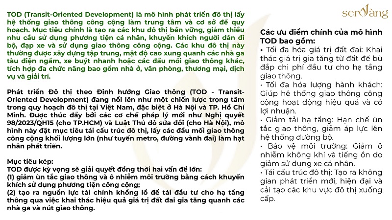 Khái niệm: TOD là mô hình phát triển đô thị lấy hệ thống giao thông công cộng (tàu điện ngầm, xe buýt nhanh, đường sắt đô thị) làm trung tâm và cơ sở để quy hoạch. Các khu đô thị được xây dựng tập trung với mật độ cao xung quanh các nhà ga và đầu mối giao thông.