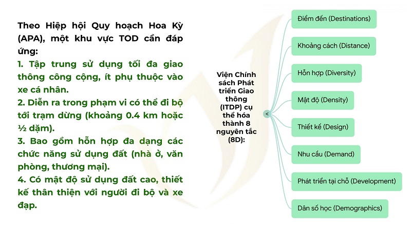 Viện Chính sách phát triển Giao thông (ITDP): Cụ thể hóa thành 8 nguyên tắc, bao gồm các yếu tố như: điểm đến, khoảng cách, tính hỗn hợp, mật độ, thiết kế, phát triển tại chỗ, và nhân khẩu học.