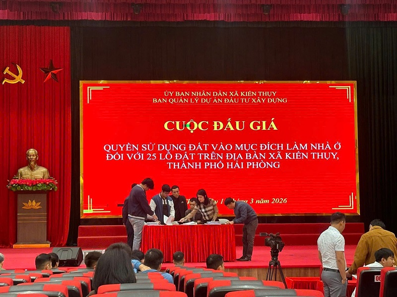 Thông báo đấu giá 25 lô đất trên địa bàn xã Kiến Thụy, TP Hải Phòng tháng 3 năm 2026 Ngày đăng : 07/03/2026 | 44 lượt xem Trung tâm Dịch vụ đấu giá tài sản thành phố Hải Phòng ( thuộc Sở Tư Pháp TP Hải Phòng) tổ chức đấu giá quyền sử dụng đất gồm 25 lô đất trên địa bàn xã Kiến Thụy, TP Hải Phòng