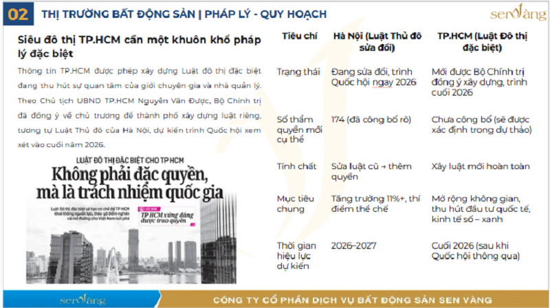 Luật Đô thị đặc biệt: Dự kiến trình Bộ Chính trị vào cuối năm 2026 để tạo khung pháp lý riêng biệt cho TP.HCM phát triển theo mô hình “Thành phố toàn cầu”.