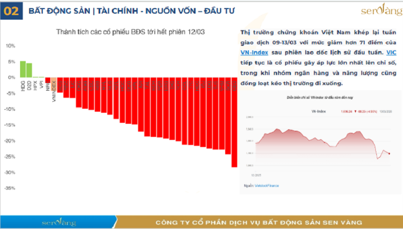 Thị trường chứng khoán: Chỉ số VN-Index biến động mạnh, dao động quanh ngưỡng 1.700 điểm (giảm từ đỉnh cao hơn 1.900 điểm). Cổ phiếu bất động sản ghi nhận mức sụt giảm đáng kể, tiêu biểu như mã CEO âm 30%.
