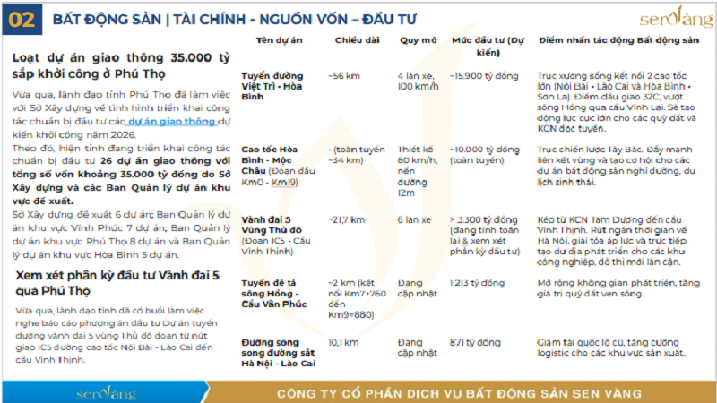 Phú Thọ: Sắp khởi công 26 dự án giao thông với tổng vốn 35.000 tỷ đồng. Các tuyến trọng điểm bao gồm: Việt Trì – Hòa Bình (kết nối hai cao tốc Nội Bài – Lào Cai và Hòa Bình – Sơn La), Vành đai 5 vùng Thủ đô, cầu Vân Phúc. Các dự án này kỳ vọng tạo động lực mạnh mẽ cho bất động sản công nghiệp dọc tuyến.