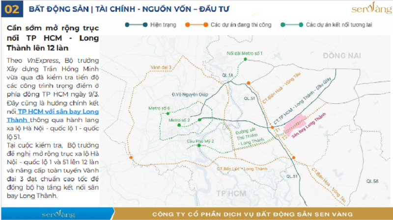 Kết nối Sân bay Long Thành: Đề xuất mở rộng trục TP.HCM – Long Thành lên 12 làn xe. Hiện tại, kết nối giao thông còn yếu (mất 5 tiếng di chuyển), mục tiêu rút ngắn xuống 30-45 phút thông qua các tuyến Metro số 2, số 6, cầu Phú Mỹ 2 và đường sắt Thủ Thiêm – Long Thành.
